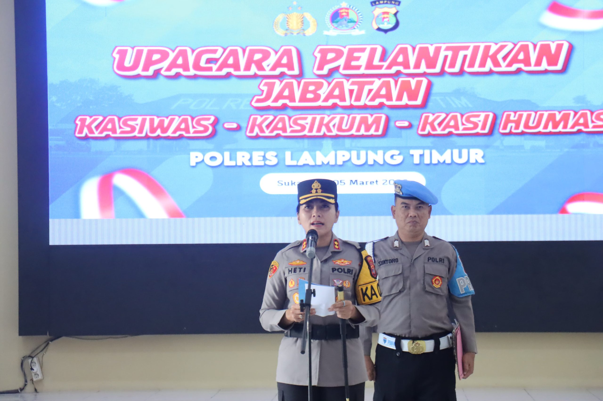 Kapolres Lampung Timur AKBP Heti Patmawati dalam amanatnya menyampaikan bahwa mutasi dan pengisian jabatan di lingkungan Polri merupakan hal yang wajar dalam rangka pembinaan organisasi dan peningkatan kinerja. Selain itu, langkah ini juga menjadi bagian dari upaya penyegaran organisasi serta peningkatan profesionalitas personel dalam menjalankan tugas dan tanggung jawab.Kapolres juga menekankan kepada para pejabat yang baru dilantik agar dapat segera menyesuaikan diri dengan tugas dan tanggung jawab yang diemban. Ia berharap para pejabat tersebut dapat menjalankan amanah dengan penuh tanggung jawab, dedikasi, serta mampu memberikan kontribusi positif bagi kemajuan organisasi.