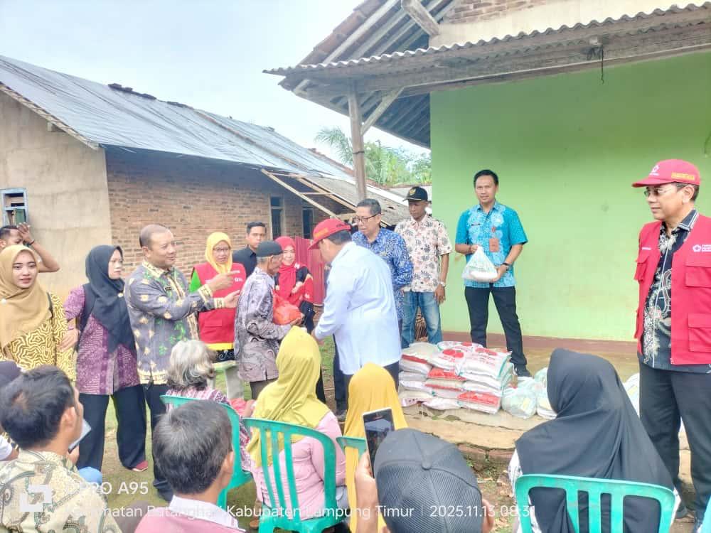 Batanghari- Ketua Palang Merah Indonesia (PMI) Kabupaten Lampung Timur yang juga Wakil Bupati Lampung Timur, Azwar Hadi, menyalurkan secara langsung bantuan bagi warga terdampak bencana alam angin puting beliung di Desa Sribasuki, Kecamatan Batanghari, dan Desa Gunung Tiga, Kecamatan Batanghari Nuban, pada Kamis (13/11/2025).