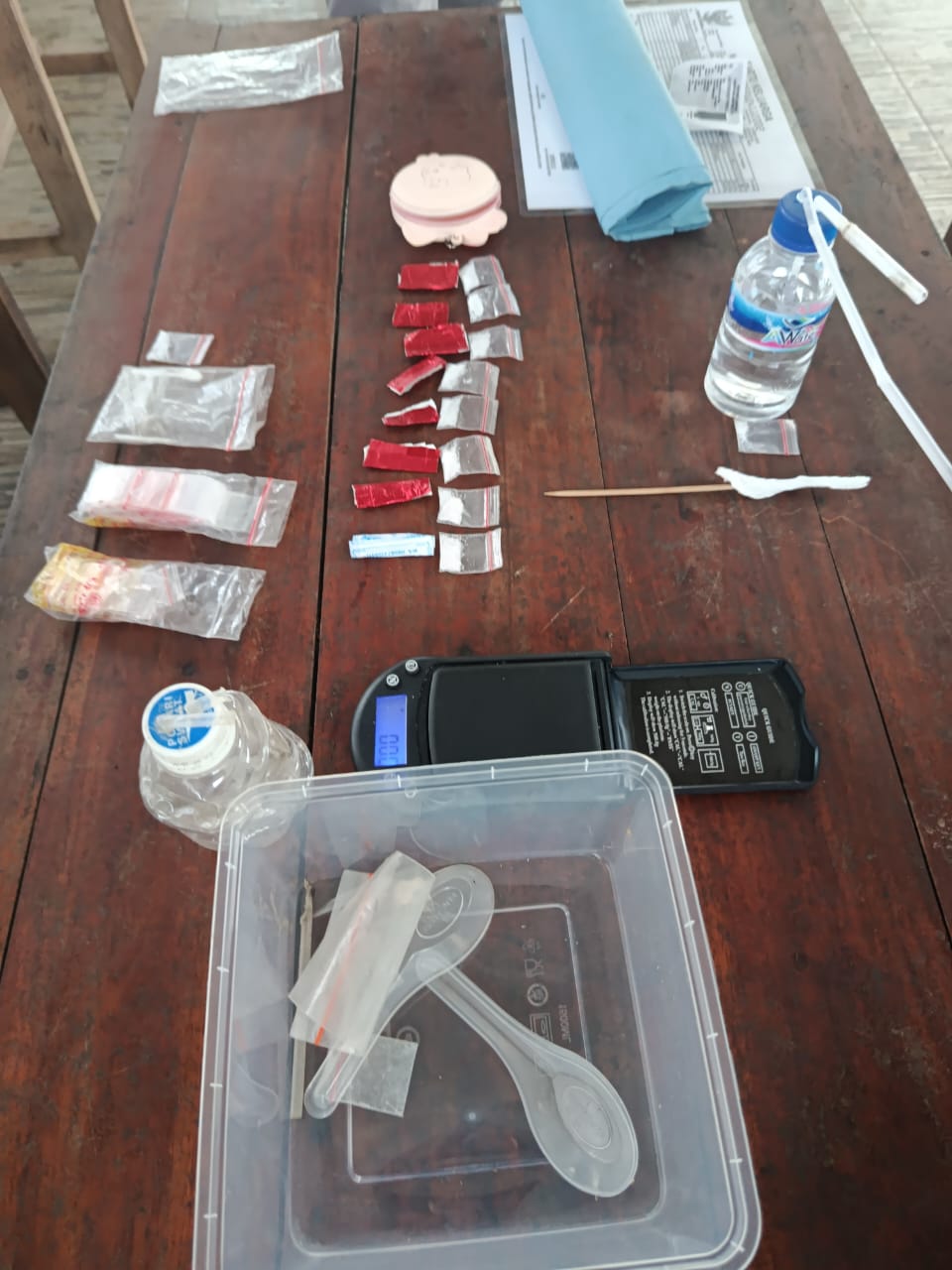 Saat dilakukan penggerebekan, petugas mendapati beberapa orang yang sedang berkumpul di dalam rumah tersebut. Rumah itu diketahui milik salah satu pelaku berinisial J. Di dalam rumah tersebut juga terdapat pelaku lainnya yakni M, HP, dan AP.Petugas kemudian melakukan pemeriksaan terhadap para pelaku serta melakukan penggeledahan di lokasi. Dari hasil pemeriksaan dan penggeledahan tersebut, petugas menemukan sejumlah barang bukti yang diduga berkaitan dengan tindak pidana narkotika jenis sabu-sabu.